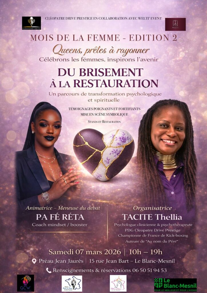 Portée par Tacite Thellia, psychologue clinicienne et fondatrice de Cléopâtre Drive Prestige, animée par Pa Fé Réta, coach mindset / booster, cette rencontre est une invitation à se relever, se restaurer et rayonner.
